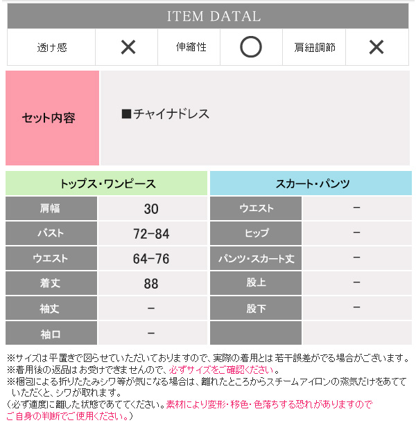 肩幅 30cm バスト 72-84cm ウエスト 64-76cm 着丈 88cm