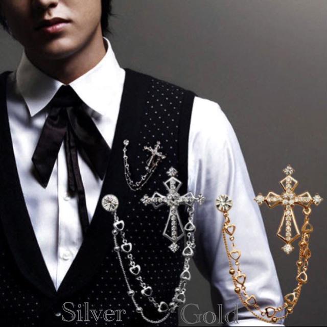 十字架ブローチ ラペルピン立体的な十字架ブローチ 3連デザインチェーン ブローチピン メンズ レディース ゴールド シルバー