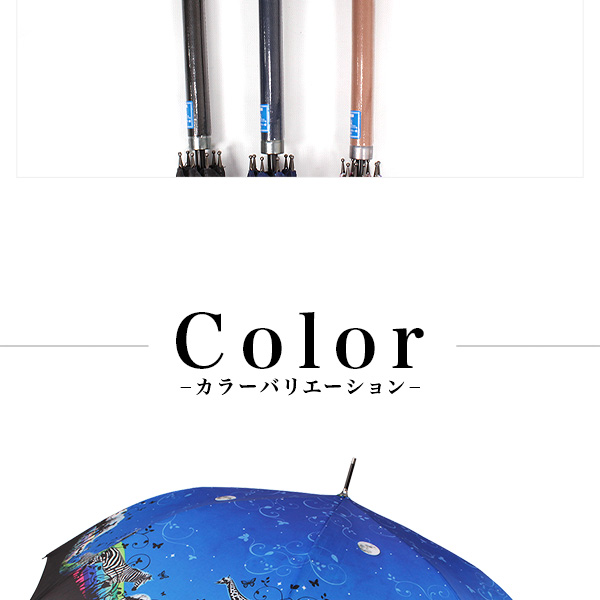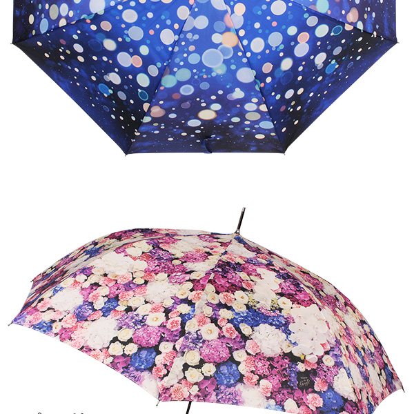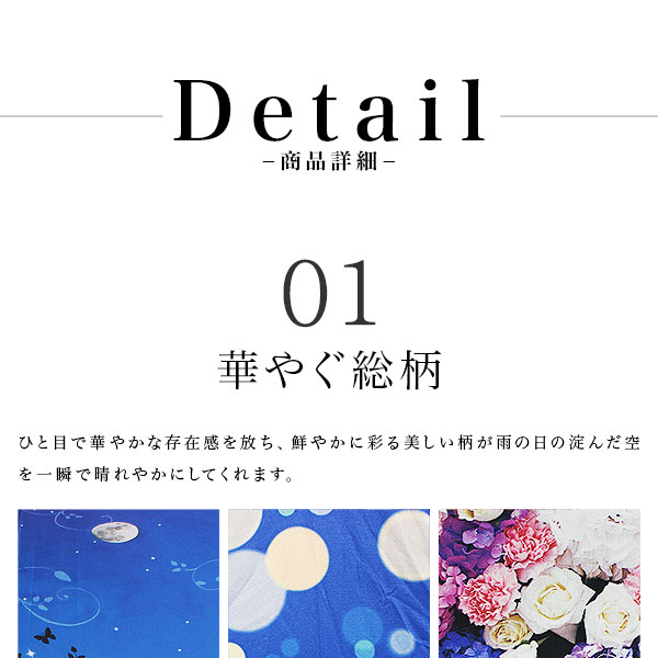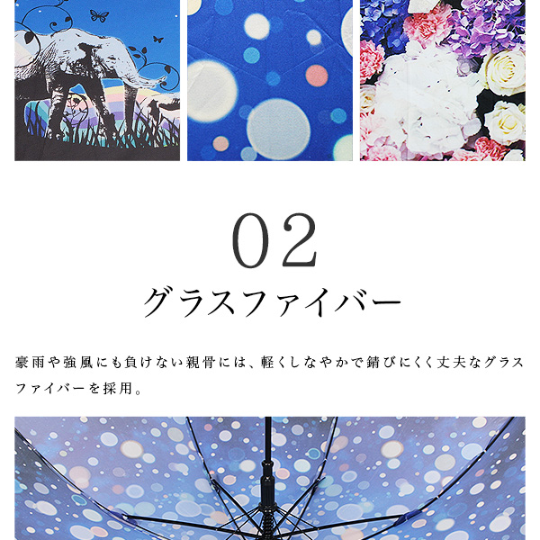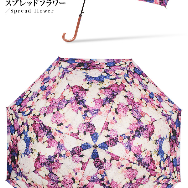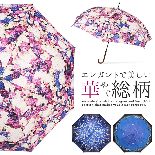 ■傘全面に大胆にプリントした総柄がエレガントなかわいいレディース傘。軽くて丈夫なグラスファイバーを採用しているので風にも強いのが特徴です。