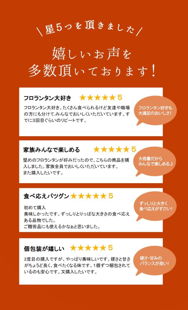 - 色々なフロランタンを食べてきましたが、これは堅すぎる様に思います。 個包装は良かったですが、、、 たぶんリピはないかなぁ。