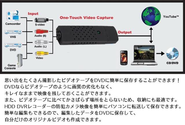 VHSテープや8mmビデオテープを、デジタル化してDVDに簡単に保存できるUSB接続ビデオキャプチャーです。