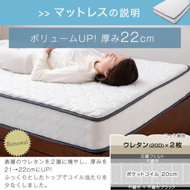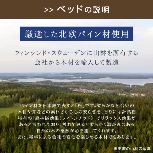 | 素材 | 【ベッド】 本体・脚:天然木パイン無垢材 すのこ:LVL(厚み18mm) ラッカー塗装 ※傷防止フェルト付属 【マットレス】 表地:ポリエステル100%、裏面:不織布 内部:ポケットコイル、ウレタンフォーム、シリコンフィル、不織布 | |