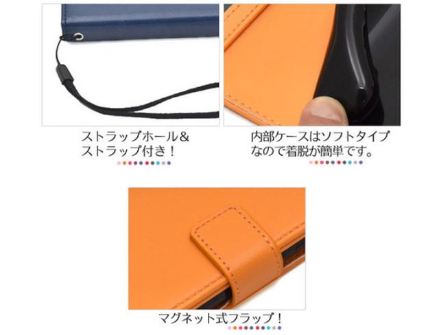 カラフルな8色展開のカラーレザー手帳型ケース。衝撃やキズなどから守ります。また、内部はソフトケースなので着脱が簡単です。