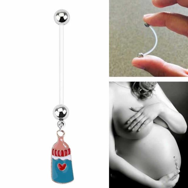 哺乳瓶のチャームが揺れるテフロンシャフトのマタニティへそピアス。 テフロンシャフトだけでも別売りしているので、切りすぎても大丈夫。 妊婦用としてだけでなく、ホールのトラブルや金属アレルギーの人にもおすすめ!シャフト部分が長いテフロン素材で出来ているので妊娠の時に皮膚が伸びても大丈夫。また、テフロンは抗菌性も高く安心のヘソピアスです。妊娠中の人でも、可愛いヘソピアスをしたい!