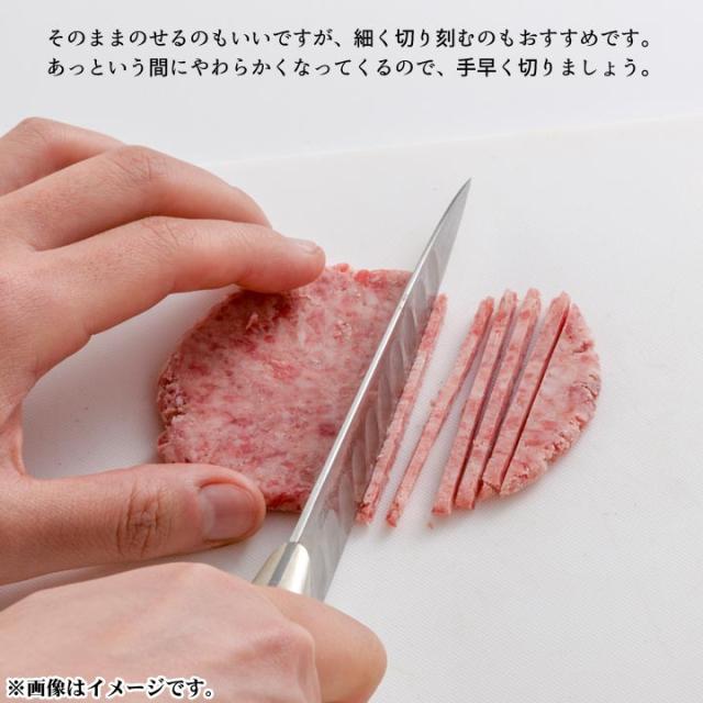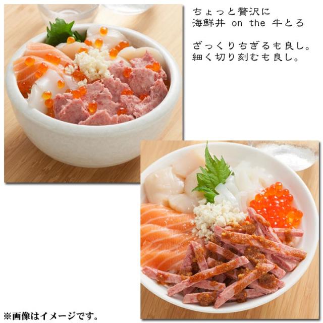 | 「牛とろ」に新しい形が出来ました! アツアツご飯に凍ったままポンと乗せるだけ! より手軽に「牛とろ」が楽しめます。 一枚あたり、お茶碗一杯分になっています。 一枚ずつの包装で使い切りタイプ♪ これにより賞味期間も長くなりました。 外箱の中には商品と蓄冷材が入るので、贈答用にもピッタリです。 牛とろ5は加工品(生ハム製法=非加熱食肉製品)です。 ユッケ風にアレンジしてもお召し上がりいただけます。 |