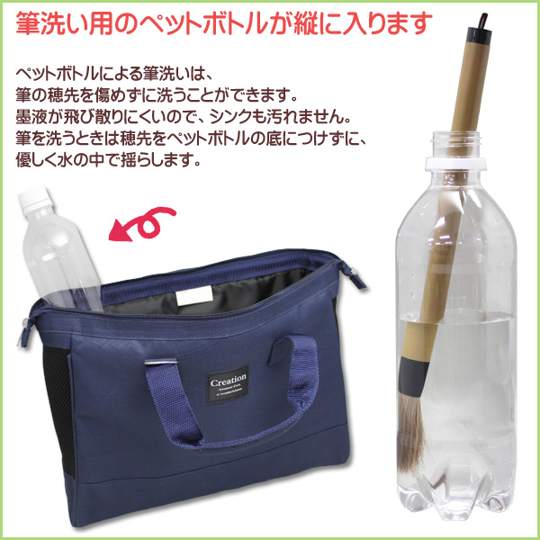 ◆バッグの中は仕切りなしのマチ広めなので書初め用の下敷きや墨池なども追加で収納でき、大容量です。