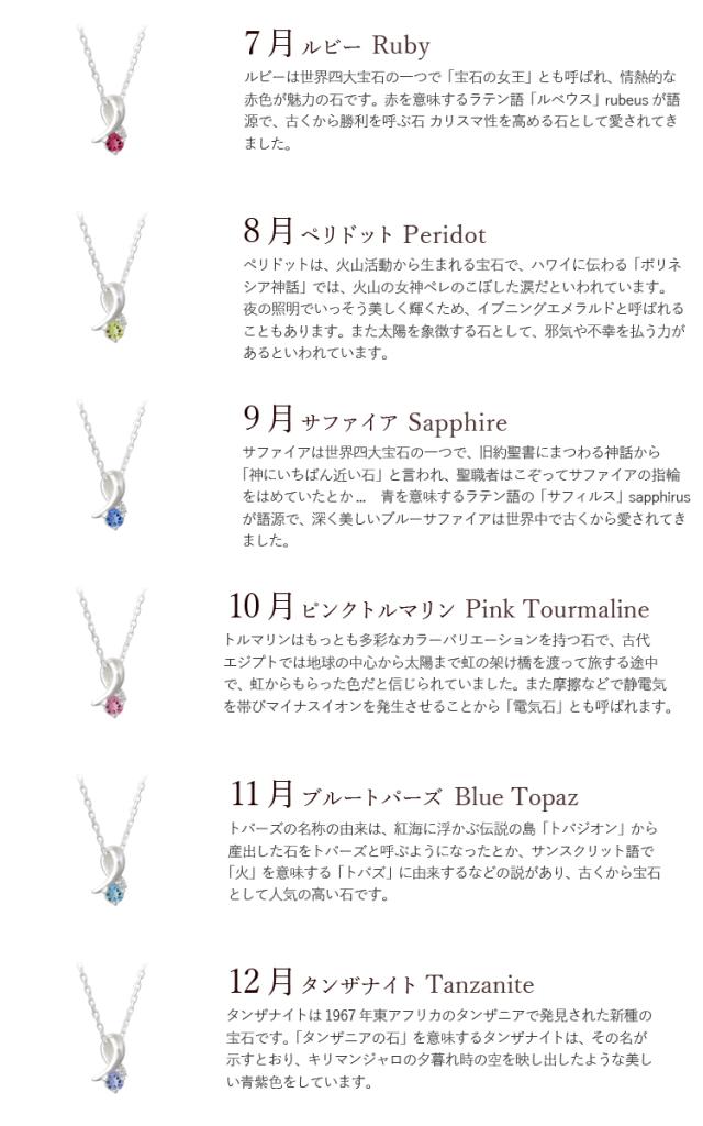 | 素材 | シルバー925 天然誕生石φ3mm 1月ガーネット 2月アメジスト 3月アクアマリン 4月ホワイトサファイア 5月エメラルド 6月ムーンストーン 7月ルビー 8月ペリドット 9月サファイア 10月ピンクトルマリン 11月ブルートパーズ 12月タンザナイト ※選択肢にない誕生石は欠品中です。 |