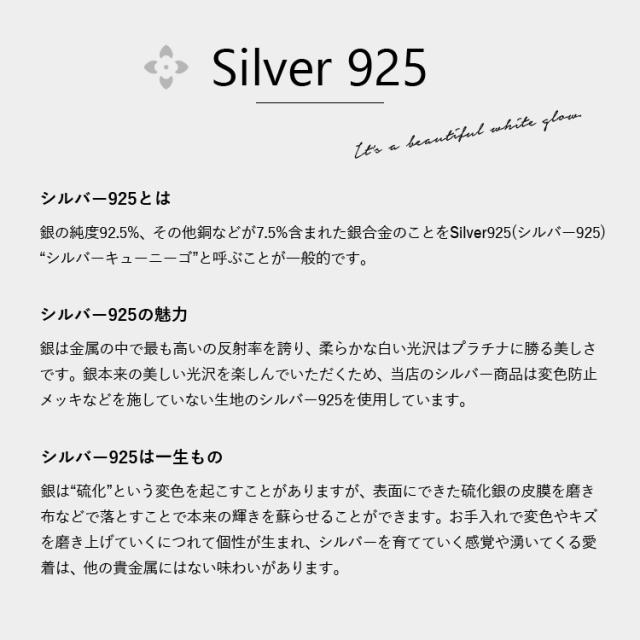 ・シルバー925は、空気中の成分や汗に反応してくすんだり黒ずんだりする性質があります。 お使いいただくうちに古びたアンティークジュエリーのように変わっていく色の風合いを楽しむこともできますし、 綺麗な光沢を楽しみたい場合は磨き布や研磨剤でお手入れすればピカピカの状態に戻る味わい深い金属です。 個人差はありますが着用始めでは稀にシルバーに接している部分の肌に黒く色をつけることがございますが石けんで水洗いすると落ちます。 しばらくお使いになると色移りはなくなります。