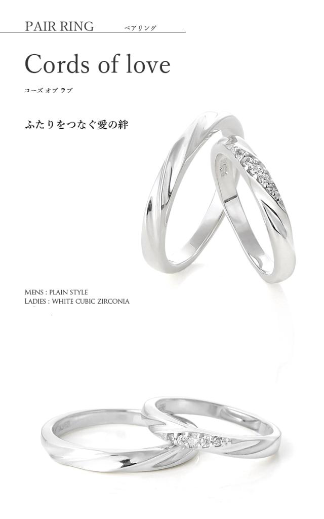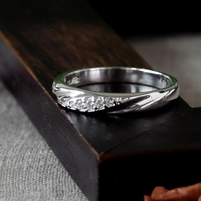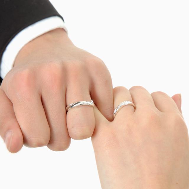 流麗な曲線が美しいペアリング。男性側はシンプルなプレーンタイプ、女性側には5石のキュービックジルコニアが輝きます。