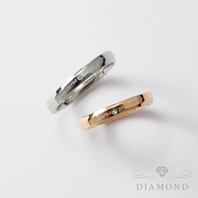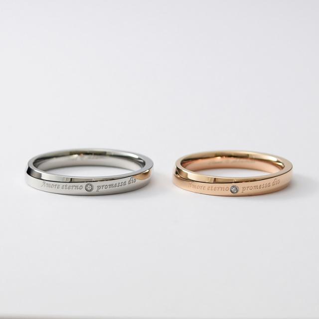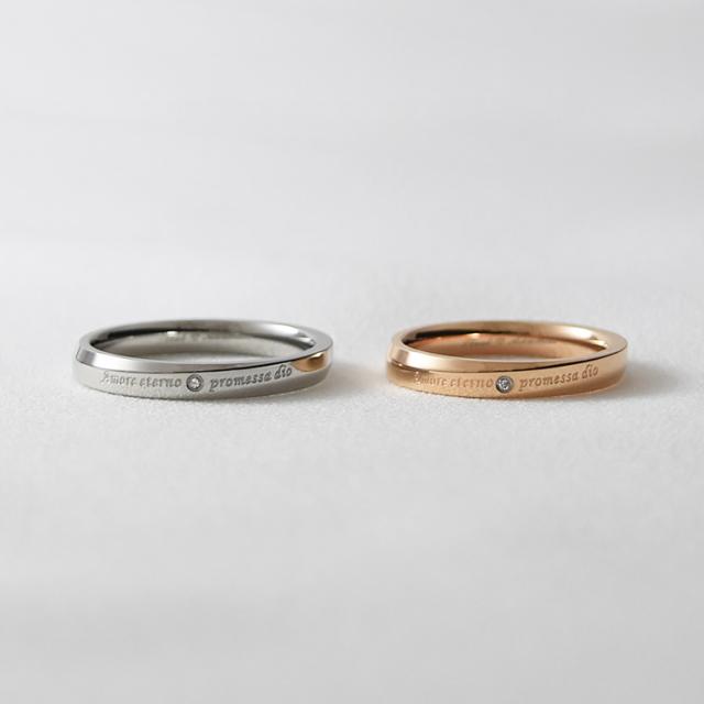 ダイヤモンドをあしらったテーパーデザインに、Amore eterno Promessa dio(永遠に愛することを神に約束する)のメッセージを添えたペアリング。