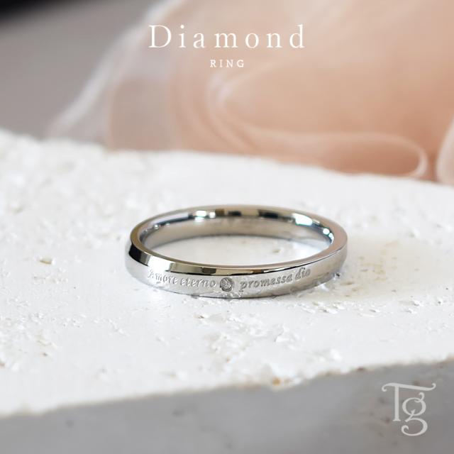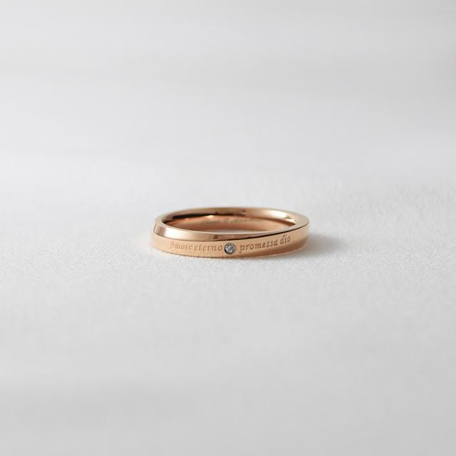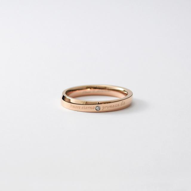 ダイヤモンドをあしらったテーパーデザインに、Amore eterno Promessa dio(永遠に愛することを神に約束する)のメッセージを添えたリング。