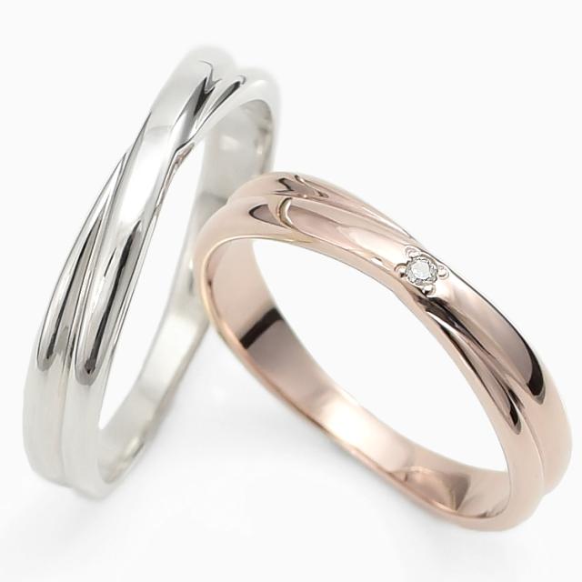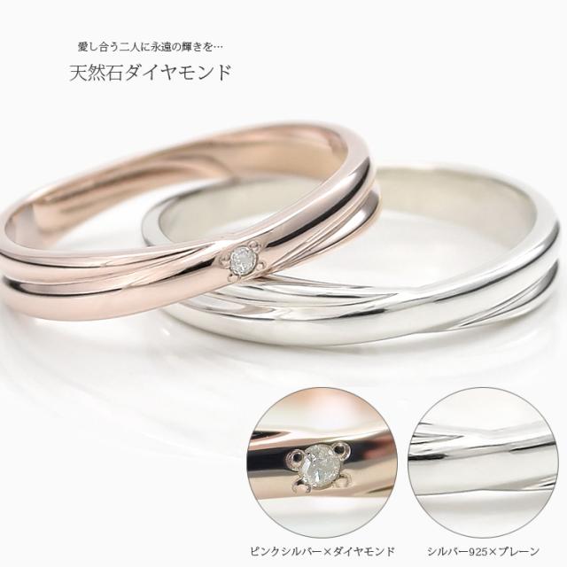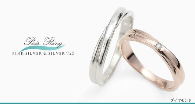 着け心地なめらかな細身のXラインに女性のリングにはダイヤモンドをあしらったピンクシルバーとシルバー925のペアリング。
