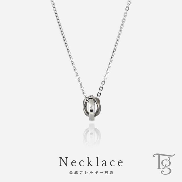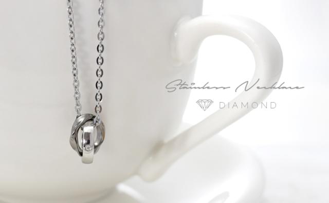 メビウスリングとダイヤモンドをあしらった甲丸リングが繋がるダブルリングネックレス。