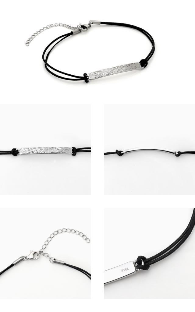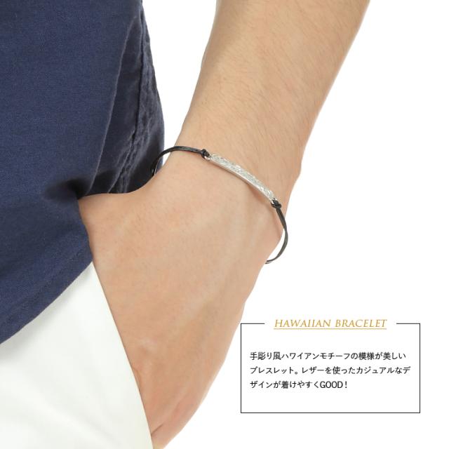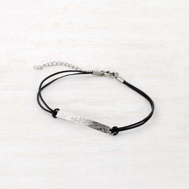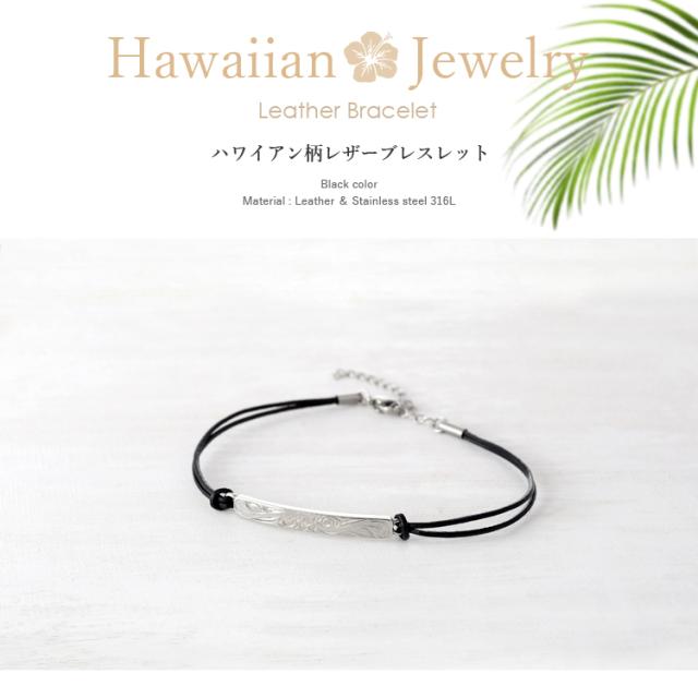 ブレスレット ハワイアンジュエリー メンズ 刻印無料 レザー 革 金属アレルギー対応サージカルステンレス316L プレート プルメリア スクロール gbss172bk