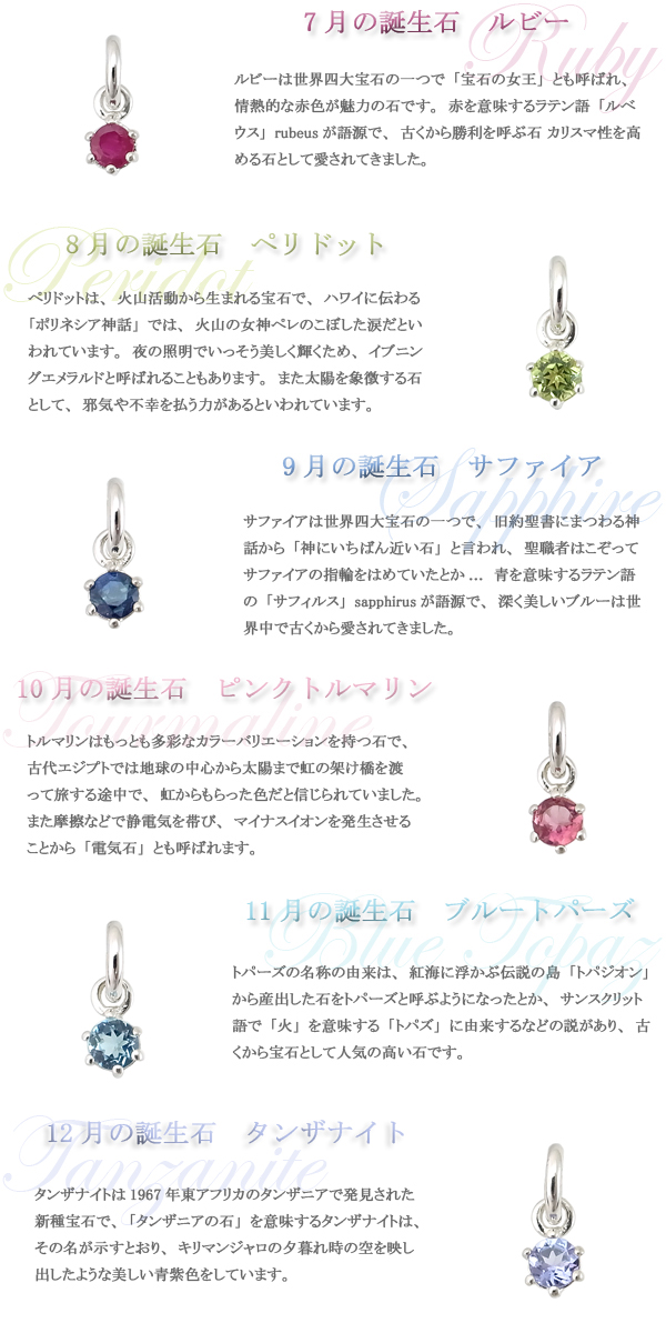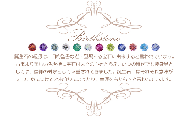 | 素材 | シルバー925 誕生石 (ガーネット/アメジスト/アクアマリン/ホワイトサファイア/エメラルド/ムーンストーン/ルビー/ペリドット/サファイア/ピンクトルマリン/ブルートパーズ/タンザナイト) ※選択肢にないイニシャル・誕生石は欠品中です。 |