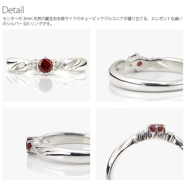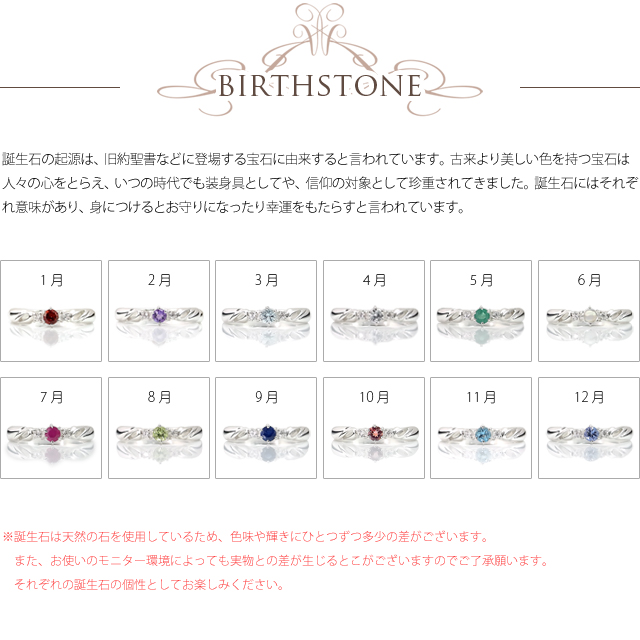 | 素材 | シルバー925 メインストーン:天然誕生石φ3mm 1月ガーネット 2月アメジスト 3月アクアマリン 4月ホワイトサファイア 5月エメラルド 6月ムーンストーン 7月ルビー 8月ペリドット 9月サファイア 10月ピンクトルマリン 11月ブルートパーズ 12月タンザナイト サイドストーン:キュービックジルコニア ※選択肢にない誕生石は欠品中です。 |