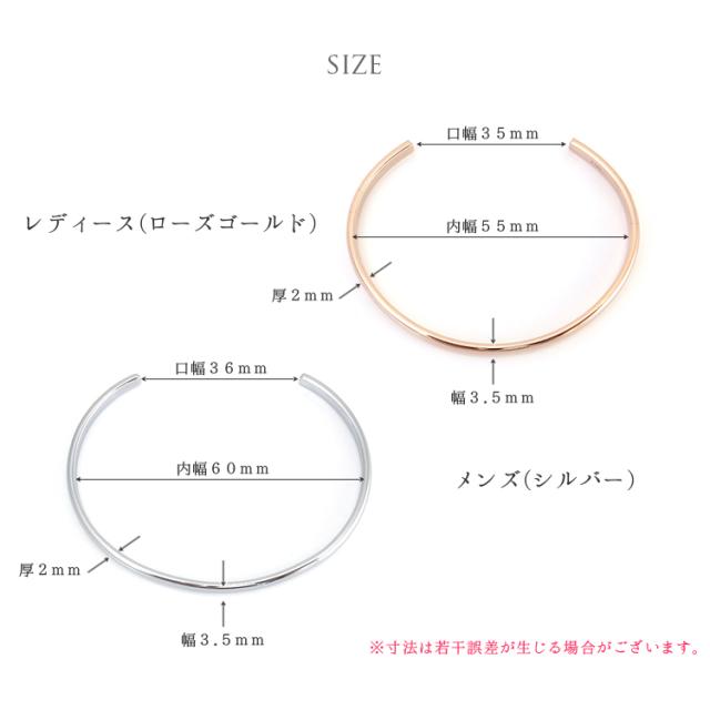 | 寸法/重量 | メンズ:幅3.5mm厚2mm内幅60mm口幅36mm/7.4g レディース:幅3.5mm厚2mm内幅55mm口幅35mm/6.2g |