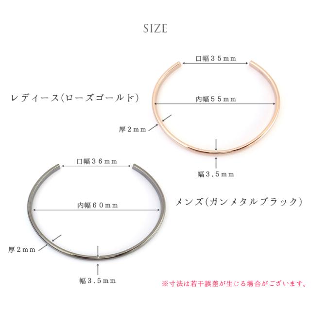 | 寸法/重量 | メンズ:幅3.5mm厚2mm内幅60mm口幅36mm/7.4g レディース:幅3.5mm厚2mm内幅55mm口幅35mm/6.2g |