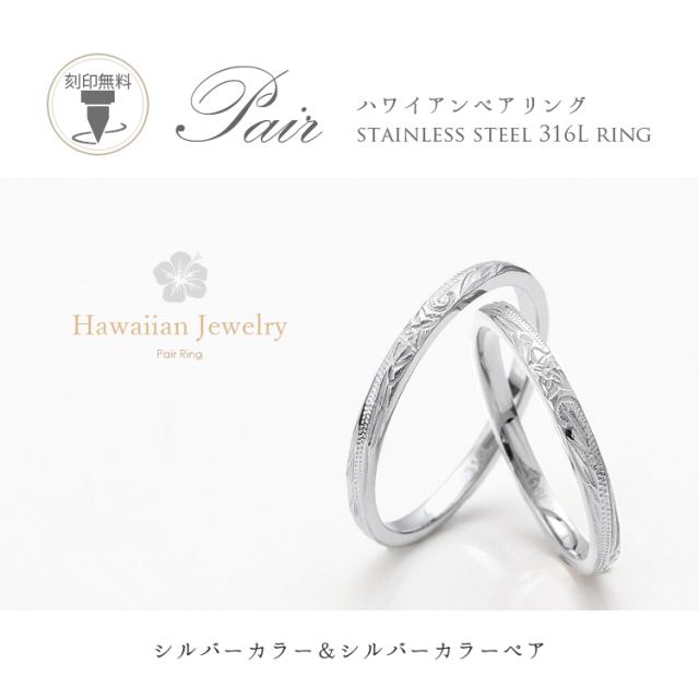 ハワイアンジュエリー ペアリング 2本セット ステンレス 刻印無料 つけっぱなし 甲丸 細身 スクロール プルメリア おしゃれ ハワイアン シルバーカラー 指輪 マリッジリング 結婚指輪 サージカルステンレス 316L ノンアレルギー 金属アレルギー対応 (grss580sv_sv_pair)