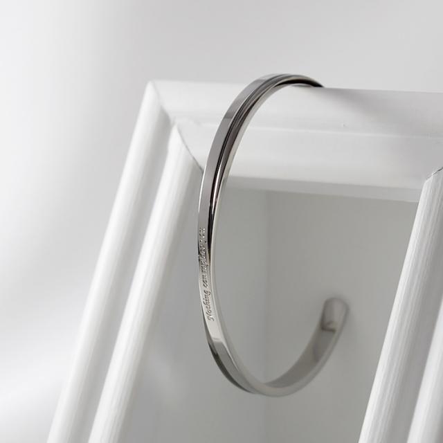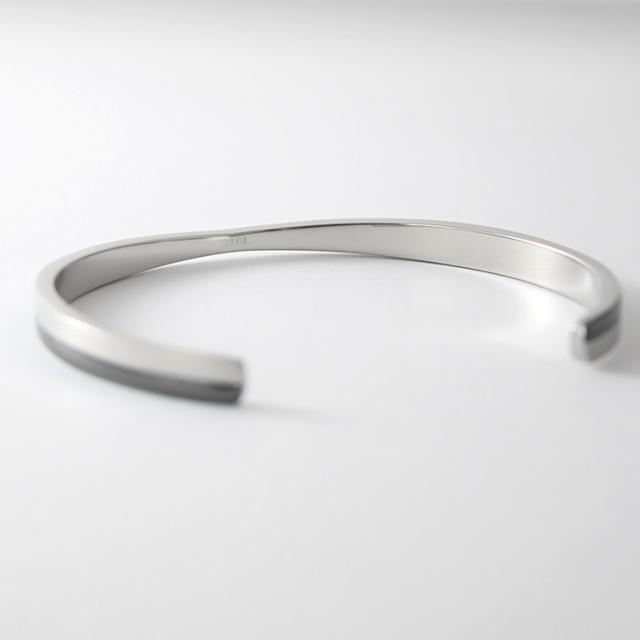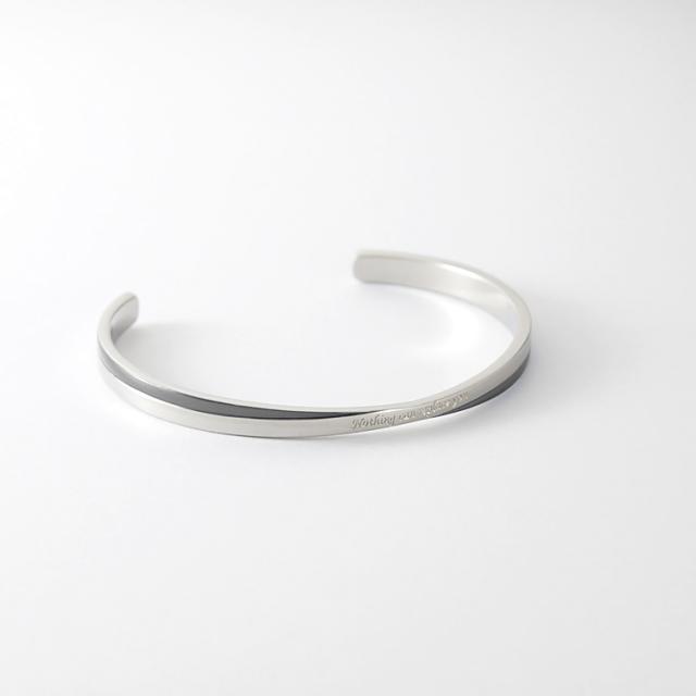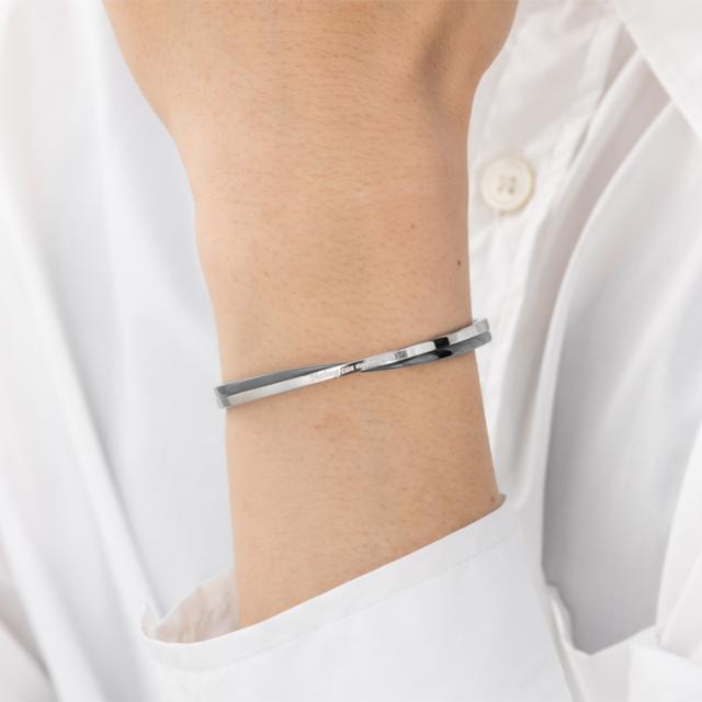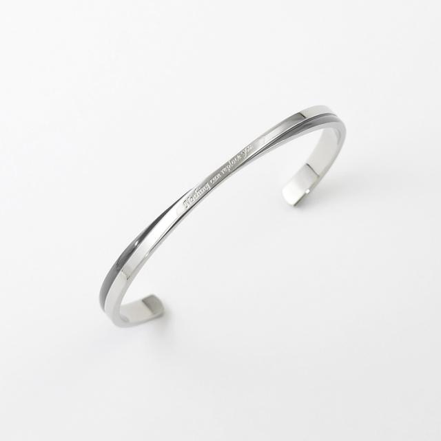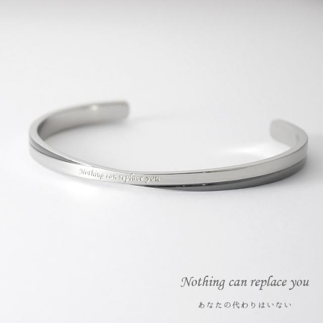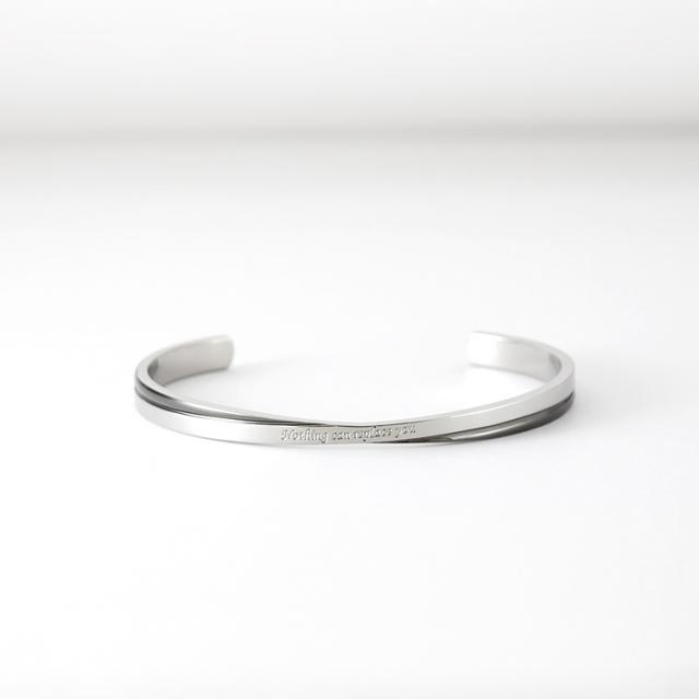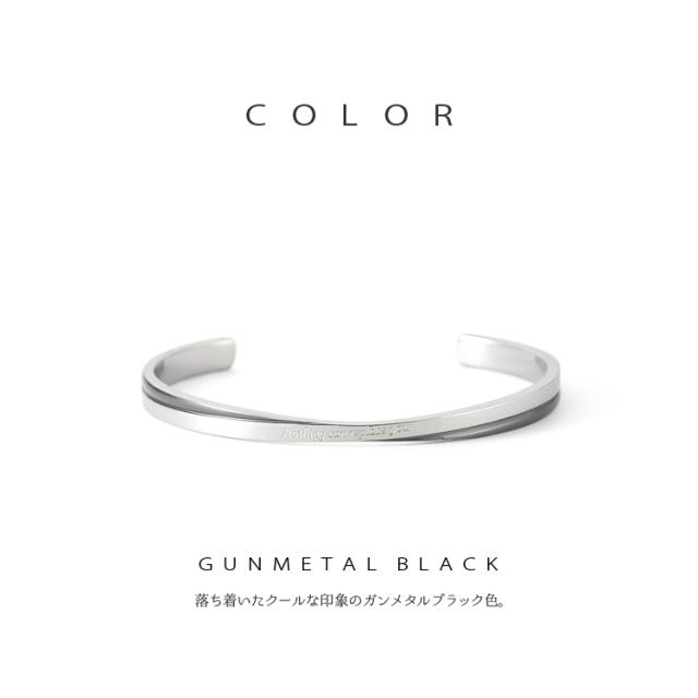 【単品】ツートンカラーのクロスラインがおしゃれなメッセージバングル。落ち着いたガンメタルメタルブラックの配色がかっこいい。 バングル内側には無料で名入れ刻印をお入れいたします。誕生日、記念日、クリスマス、バレンタインデー、父の日、自分へのご褒美など特別なギフトにおすすめです。 素材にはサージカルステンレス316Lを使用しているので、金属アレルギーの方も安心してお使いいただけます。