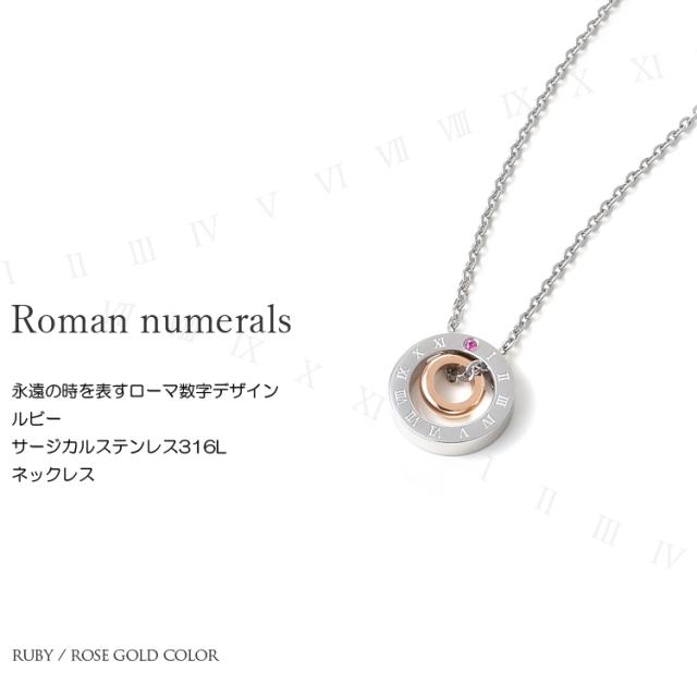ネックレス レディース ステンレス 刻印 ルビー ローマ数字