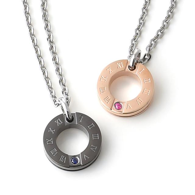 ペアネックレス 2本セット ステンレス 金属アレルギー 刻印無料 シンプル 大人 ルビー サファイア ローマ数字 リングモチーフ つけっぱなし ペア ネックレス ペンダント サージカルステンレス ブラック ピンクゴールドカラー gpss1037pair