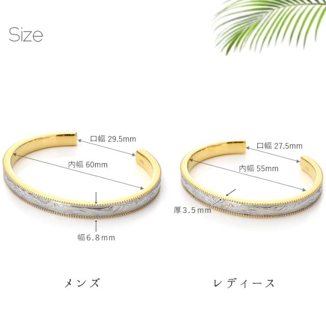 | 寸法/重量 | メンズ:幅6.8mm厚3.5mm内幅60mm口幅29.5mm/26.8g レディース:幅6.8mm厚3.5mm内幅55mm口幅27.5mm/21.8g |