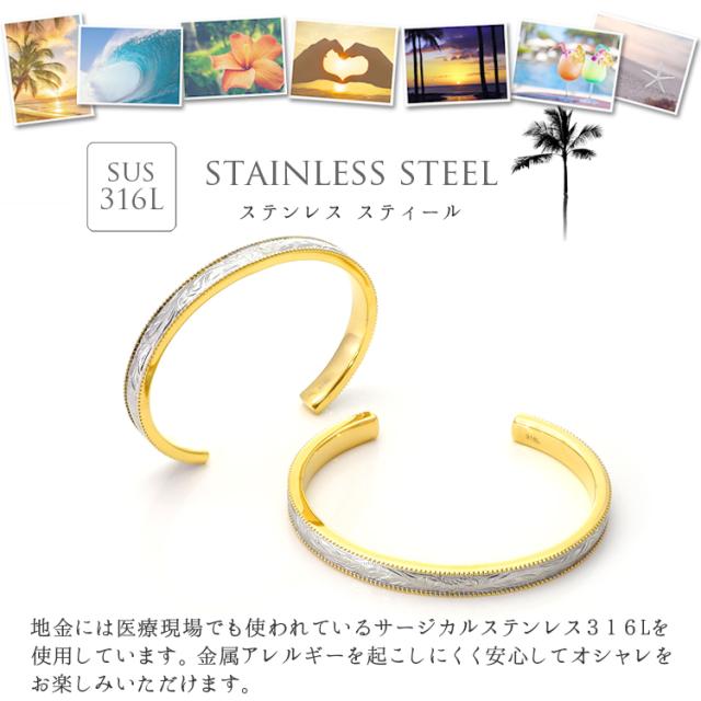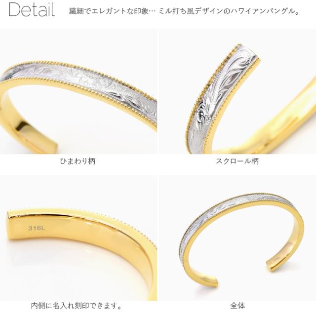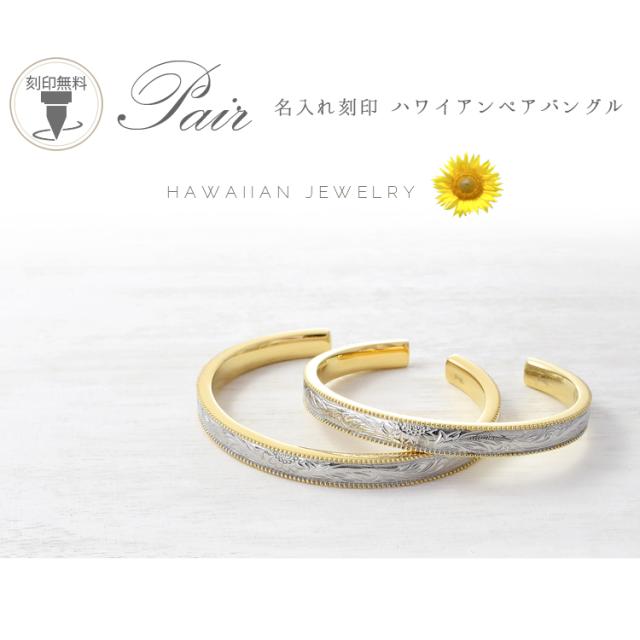 ハワイアンジュエリー ペアバングル ブレスレット 刻印 ステンレス つけっぱなし シンプル 向日葵 プルメリア ミル打ち柄 おしゃれ ハワイアン サージカルステンレス ノンアレルギー 金属アレルギー対応 2本セット価格 (gbsg73pair)
