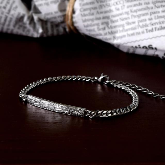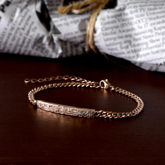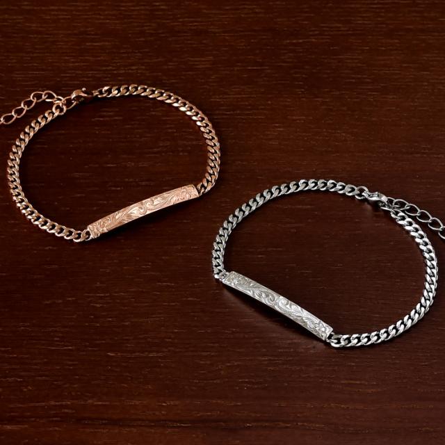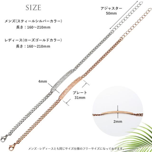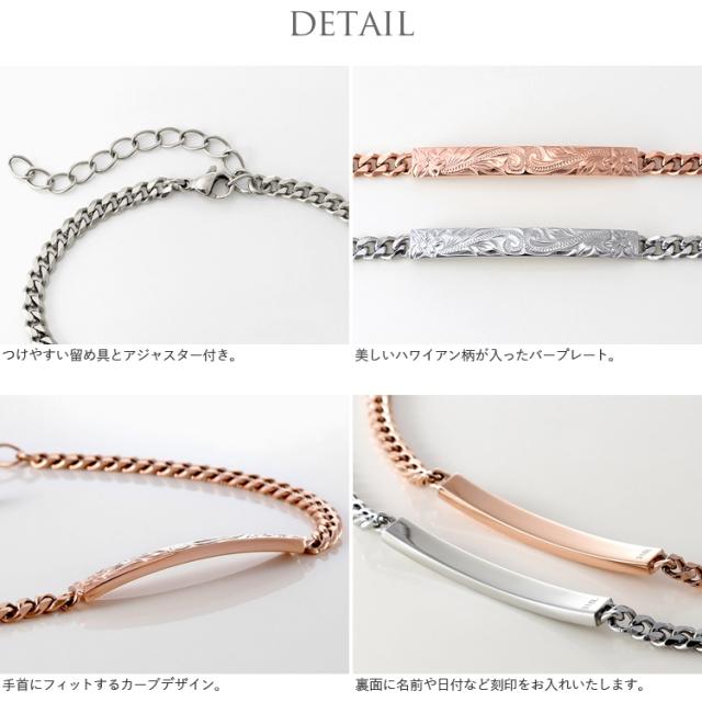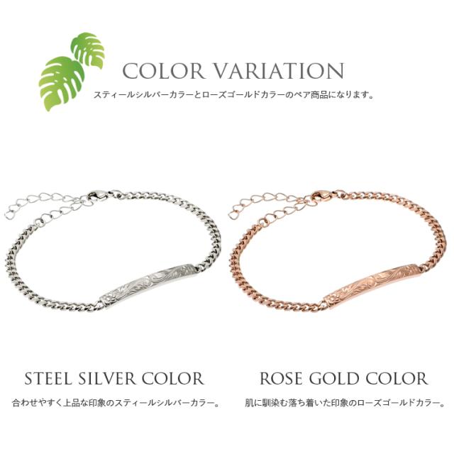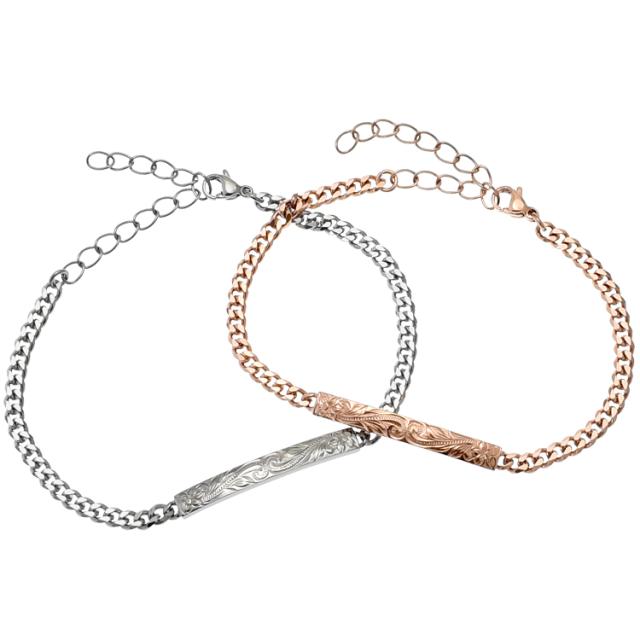 ハワイの伝統的なモチーフが手彫り風にデザインされたペアブレスレットです。【スティールシルバーカラー&ローズゴールドカラー】 カット仕上げのキヘイチェーンが手元に上品な存在感を与えてくれます。 素材には金属アレルギーになりにくいサージカルステンレス316Lを使用しています。 IDプレート表面にハワイで縁起が良いとされているプルメリア(花)とスクロール(波)の繊細な模様がデザインされています。 裏面には名前や日付、メッセージなど無料で刻印をお入れすることができるので、誕生日、記念日、クリスマス、ホワイトデー、母の日、父の日など特別なギフトにおすすめです。