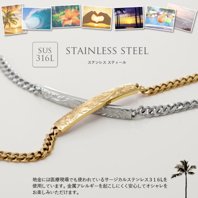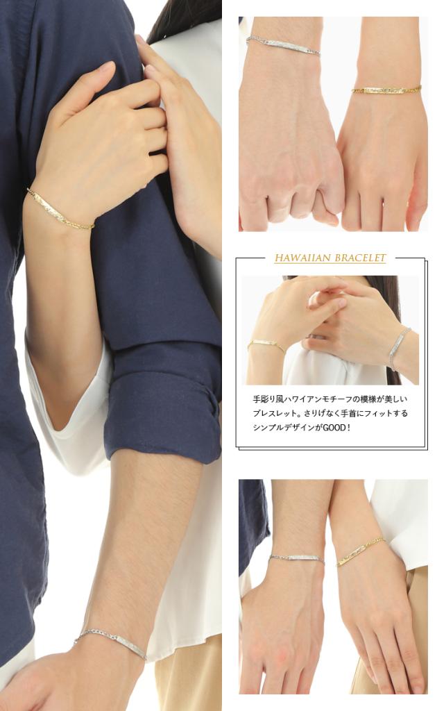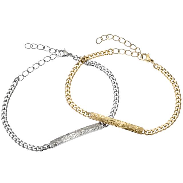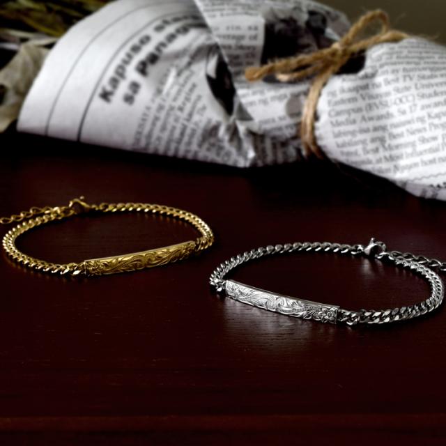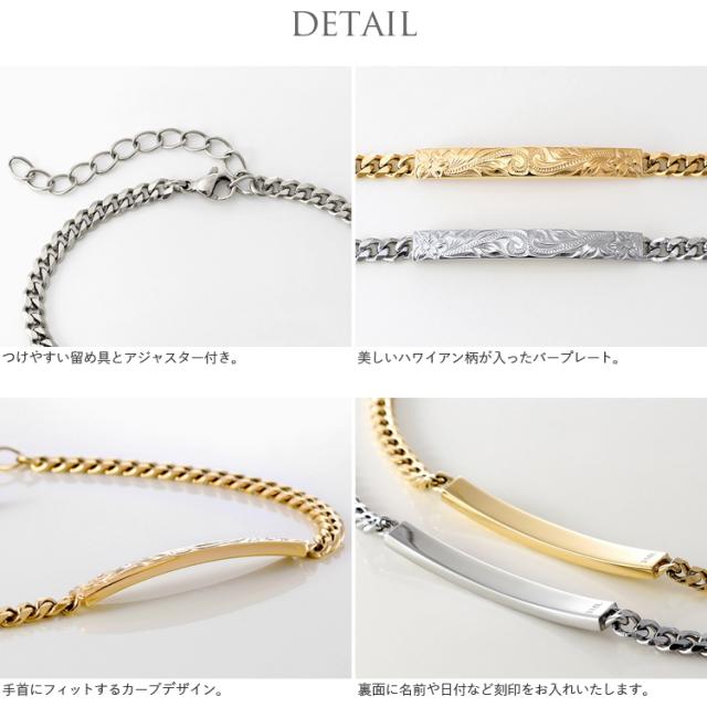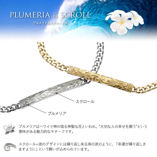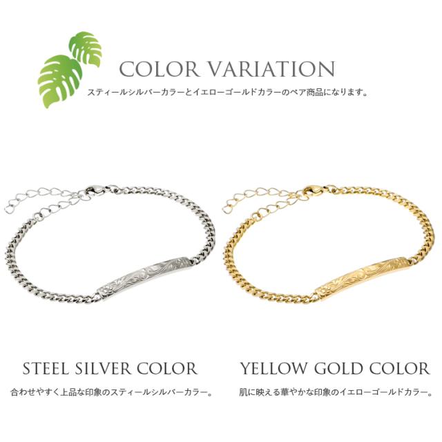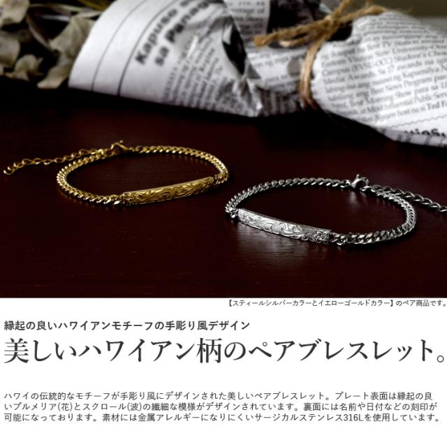 ハワイの伝統的なモチーフが手彫り風にデザインされたペアブレスレットです。【スティールシルバーカラー&イエローゴールドカラー】 カット仕上げのキヘイチェーンが手元に上品な存在感を与えてくれます。 素材には金属アレルギーになりにくいサージカルステンレス316Lを使用しています。 IDプレート表面にハワイで縁起が良いとされているプルメリア(花)とスクロール(波)の繊細な模様がデザインされています。 裏面には名前や日付、メッセージなど無料で刻印をお入れすることができるので、誕生日、記念日、クリスマス、ホワイトデー、母の日、父の日など特別なギフトにおすすめです。
