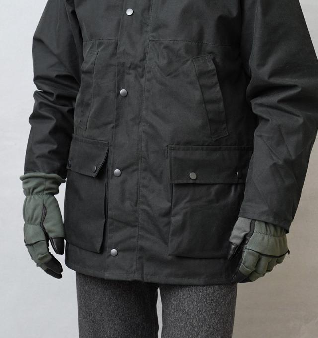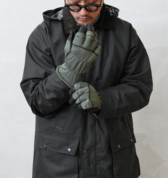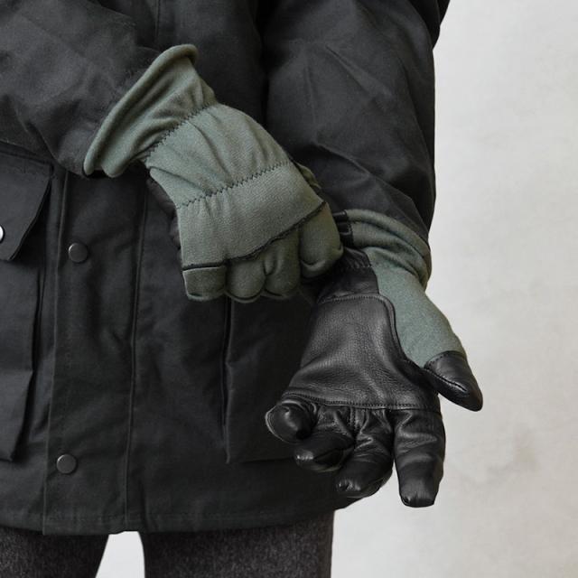 手首はフィット感のある長めのリブ編み、サラッとしたコットンのインナーには中綿が入っているので防寒性も非常に高くなっています。セージグリーンのNOMEX素材とブラックレザーの組み合わせが見た目にもバランス良く、普段遣いでも一目置かれること間違い無しのグローブ。