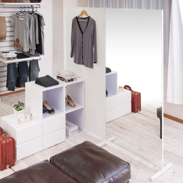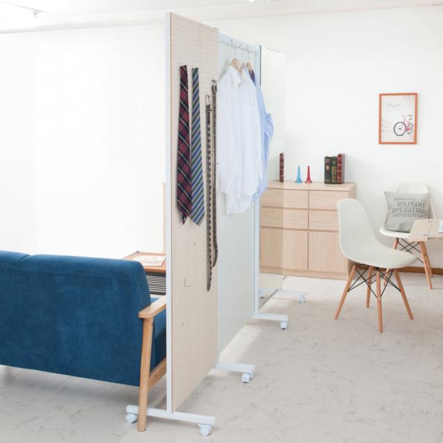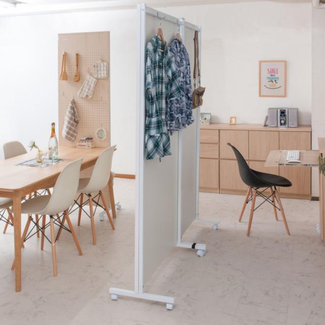 片面にハンガーフックが付いた移動式パーテーションです。目隠しだけでなく洋服掛けとしてお使いいただけます。身近に掛けておけばサッと身に着けられるのでお出掛けの際に大変便利です。