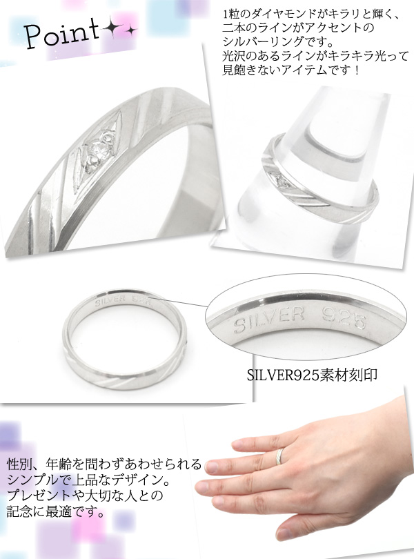 1粒のダイヤモンドがキラリと輝く、二本のラインがアクセントのシルバーリングです。 光沢のあるラインがキラキラ光って見飽きないアイテムです! 年齢性別を問わずつけられる上品なデザインなのでプレゼントや大切な人との記念に最適です。