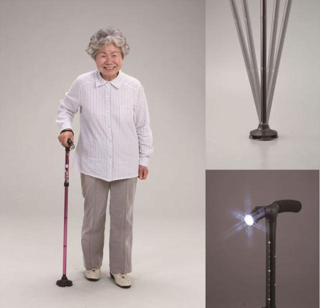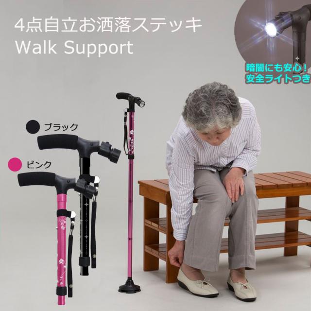 LEDライト付き4点自立お洒落ステッキ WALK SUPPORT LEDライト付き 杖 折りたたみ L懐中電灯