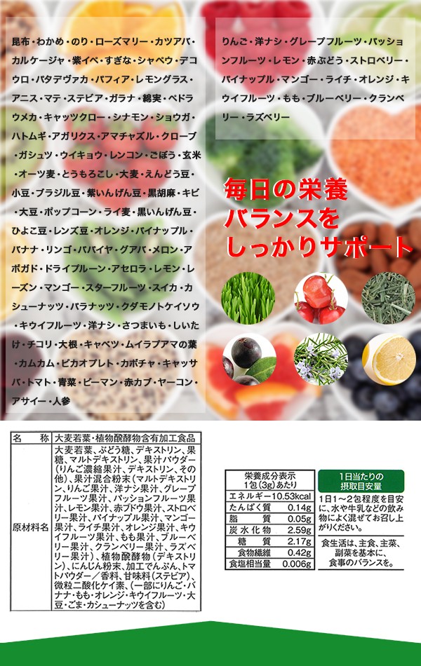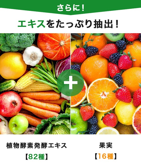 【植物発酵エキス82種類】 昆布・わかめ・のり・ローズマリー・カツアバ・カルケージャ・紫イペ・すぎな・シャペウ・デコウロ・パタデヴァカ・パフィア・レモングラス・アニス・マテ・ステビア・ガラナ・綿実・ペドラウメカ・キャッツクロー・シナモン・ショウガ・ハトムギ・アガリクス・アマチャズル・クローブ・ガシュツ・ウイキョウ・レンコン・ごぼう・玄米・オーツ麦・とうもろこし・大麦・えんどう豆・小豆・ブラジル豆・紫いんげん豆・黒胡麻・キビ・大豆・ポップコーン・ライ麦・黒いんげん豆・ひよこ豆・レンズ豆・オレンジ・パイナップル・バナナ・リンゴ・パパイヤ・グアバ・メロン・アボガド・ドライプルーン・アセロラ・レモン・レーズン・マンゴー・スターフルーツ・スイカ・カシューナッツ・パラナッツ・クダモノトケイソウ・キウイフルーツ・洋ナシ・さつまいも・しいたけ・チコリ・大根・キャベツ・ムイラプアマの葉・カムカム・ピカオプレト・カボチャ・キャッサバ・トマト・青菜・ピーマン・赤カブ・ヤーコン・アサイー・人参 【フルーツ16種類】 りんご・洋ナシ・グレープフルーツ・パッションフルーツ・レモン・赤ぶどう・ストロベリー・パイナップル・マンゴー・ライチ・オレンジ・キウイフルーツ・もも・ブルーベリー・クランベリー・ラズベリー |