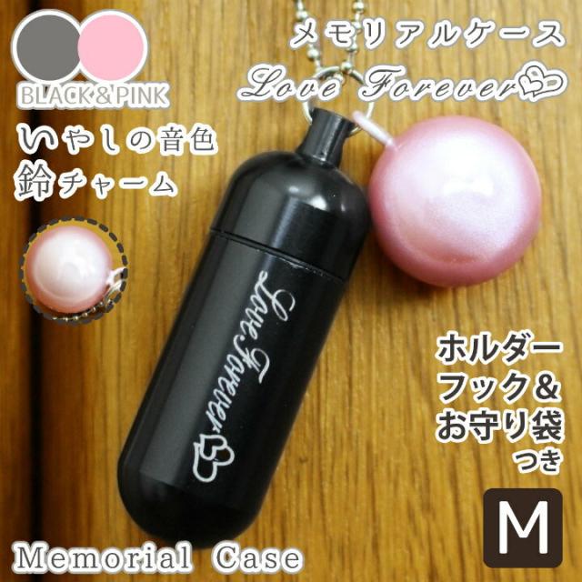 遺骨ペンダント メモリアルケース ブラック ( 中 ) 「 Love Forever 」 お守り袋+ホルダーフックつき 鈴 ピンク チャーム