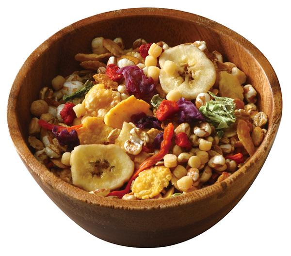 | 穀類(大麦、小麦、えん麦等)、糖類、果実類(バナナ、パパイヤ、パイナップル、いちご)、野菜類(にんじん、赤キャベツ、ブロッコリー)、豆類(大豆、大豆たんぱく)、油脂類、いも類(さつまいも)、でん粉類、乳類(チーズ、乳たん白)、ミネラル類(リン酸カルシウム、塩化ナトリウム、炭酸カルシウム)、増粘安定剤(グリセリン)、品質保持剤(プロピレングリコール)、pH調整剤、保存料(ソルビン酸カリウム、メタ重亜硫酸ナトリウム)、穀物発酵エキス、酸味料、デキストリン、乳化剤、香料、酸化防止剤(エリソルビン酸ナトリウム、ミックストコフェロール、ローズマリー抽出物)、着色料(黄4) |