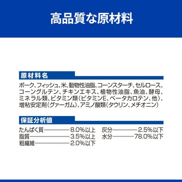 | ポーク、フィッシュ、米、動物性油脂、コーンスターチ、セルロース、コーングルテン、チキンエキス、植物性油脂、魚油、酵母、ミネラル類、ビタミン類(ビタミンE、ベータカロテン、他)、増粘安定剤(グァーガム)、アミノ酸類(タウリン、メチオニン) |