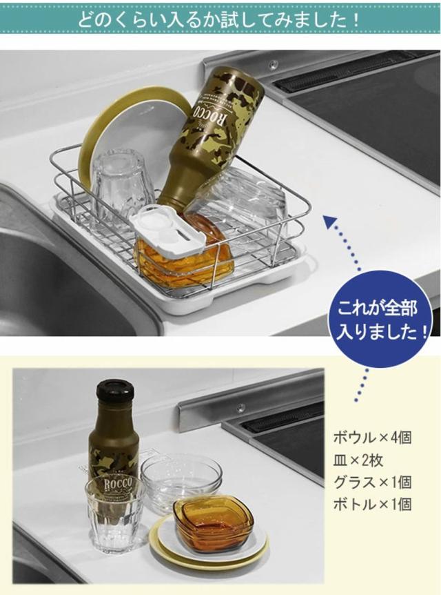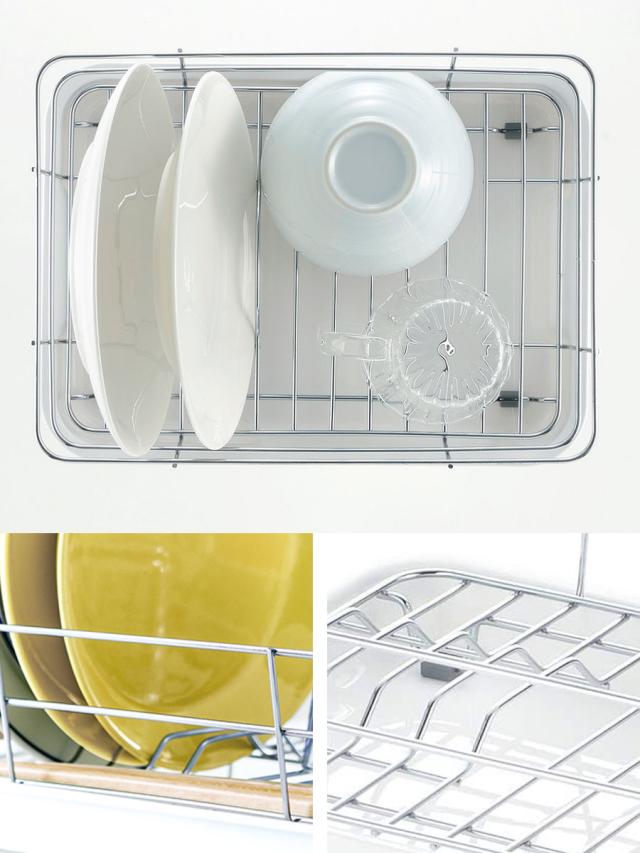 食洗機やメイン水切りに入りきらなかった時に丁度いいコンパクトサイズの水切りトレーです。お皿を立てて効率よく収納できます。立てて置くと食器が重ならず、水切れよく早く乾きます。お皿立てには直径21cmまでのお皿が4枚収納できます。