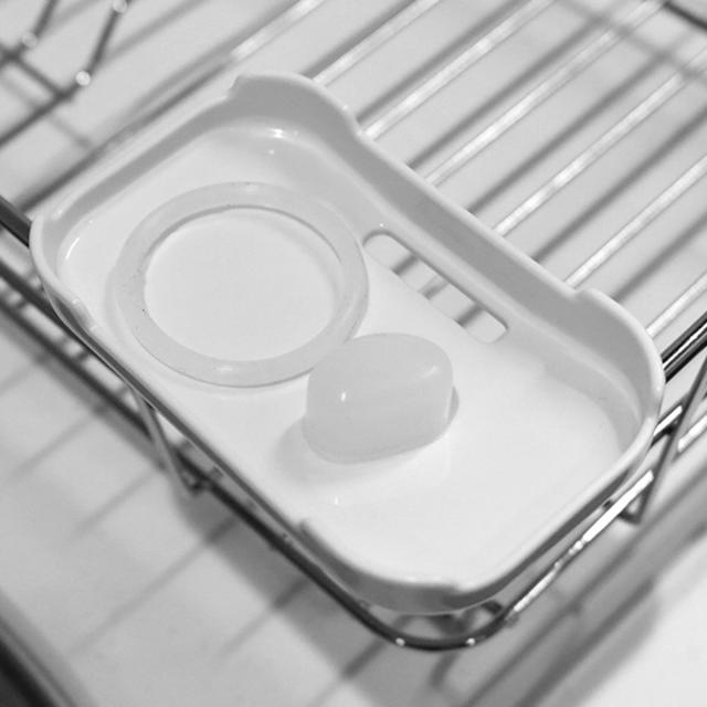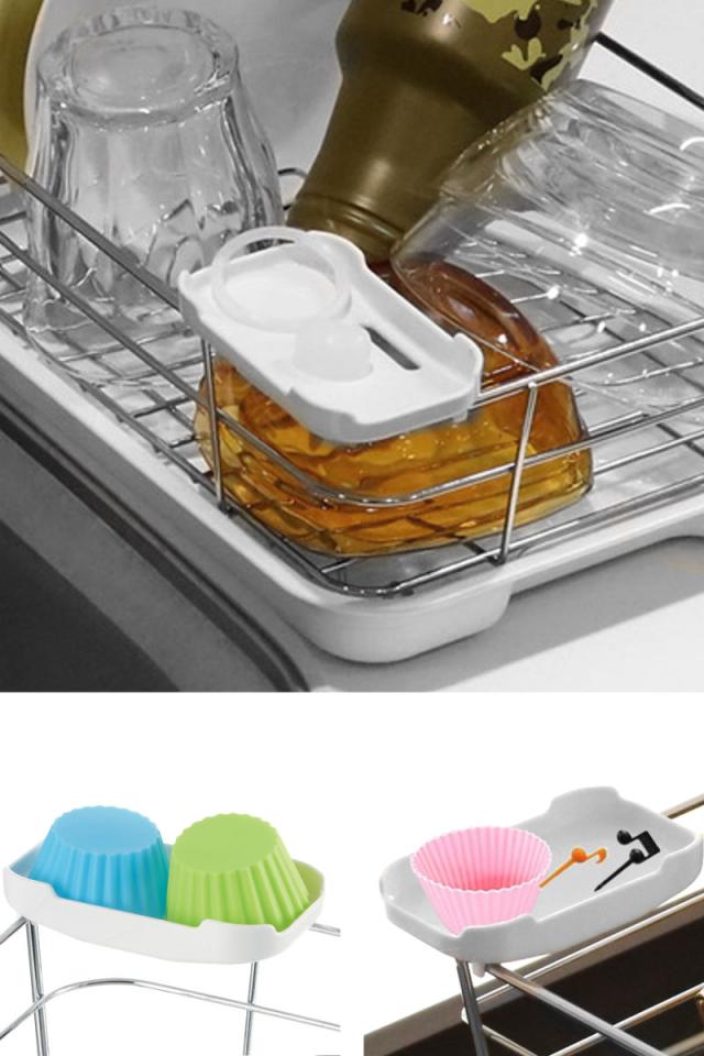 小物トレーは水切り穴つきなので、水が溜まらず清潔に乾かせます。水切りカゴの4隅に取り付け可能です。