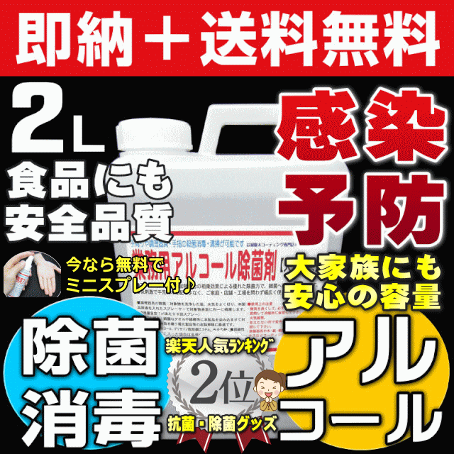 口に入れても安心な食品添加物の配合で75度相当の高い除菌力&手肌に優しい速乾性の業務用消毒用アルコール液【2L】です。お子様や幼児、敏感肌の方にも安心の弱酸性で、一般家庭から保育所、幼稚園など大切なお子様を預かる施設をはじめ、介護福祉施設、学校、企業団体、法人様の社員・スタッフの衛生管理まで幅広くお使いいただいている高品質(ISO認証取得)アルコール製剤です。即納&送料無料でお届けします!