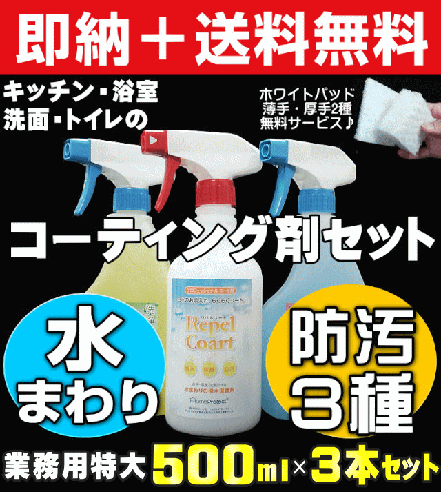 ”キレイをキープ&お掃除をラク”にできる、水まわりのコーティング剤【リペルコート&キープシャインの計3種類、業務用特大サイズの500mlセット】。防カビ・防汚・水垢予防はこれで完璧です♪しかも無料でホワイトパッドが標準&厚手タイプの2枚付き!新築スタートで心機一転の方、毎日の水まわり掃除をもっと楽しくラクにしたい方、掃除のモチベーション・テンションを上げたい方、全ての方にオススメの水まわりコーティング剤です!風雨にさらされがちな愛車・バイク・自転車等の撥水コーティング剤&洗車用シャンプーとしても使えます♪一日の家事の終わりに時間が余ったらちゃちゃっとできるくらいの手軽さが人気です♪