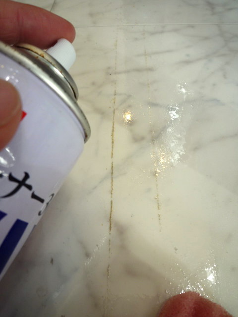 | 例えばガムテープのノリ残りの場合、こそげるだけこそいでから(事前に素材確認はしましょう) | シールはがしクリーナーを多めに噴射して、しばらく待ってから歯ブラシなどでこすります |