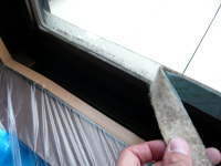 | 窓ガラスに貼った結露の吸水テープやサッシ枠の吸音テープ等は、きれいにはがれないことがあります | 長期間貼り付けて劣化したものはどれだけゆっくり丁寧にめくっても跡が残りやすいです。「カビ」が生えてしまうことも・・・ |