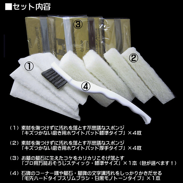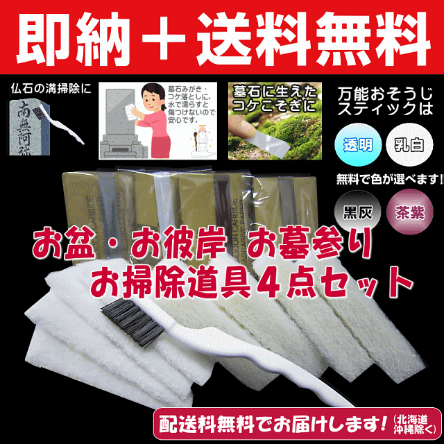 【送料無料_即納_あす楽】お盆/お彼岸 お墓参り掃除道具4点セット【墓石を傷めない特殊ホワイトパッド&コケ取りスティック&毛先しっかりスリムブラシ】