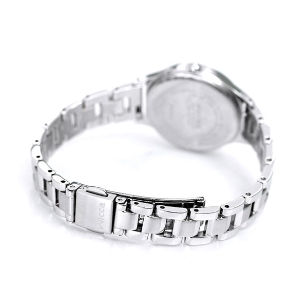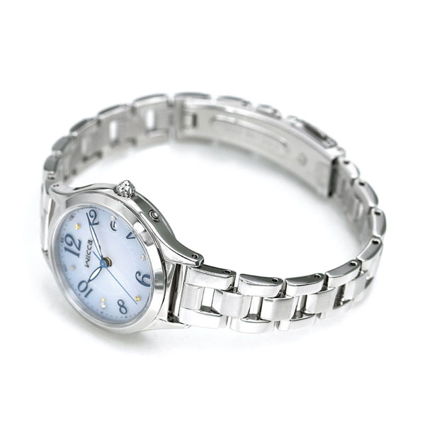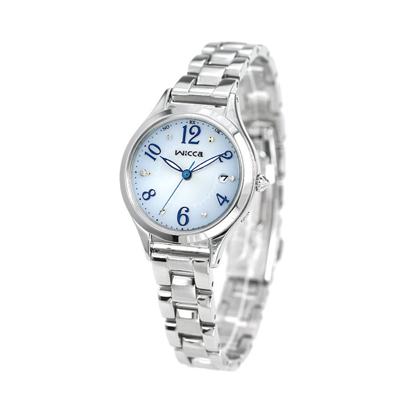 正規品 7年保証キャンペーン 送料無料 シチズン ウィッカ ソーラーテック電波時計 ハッピーダイアリー ダイヤモンド 電波ソーラー レディース 腕時計 KS1-210-91 CITIZEN wicca HAPPY DIARY アナログ ブルーグラデーション ◆ウィッカは旬のカワイイがいっぱい詰まった腕時計ブランドです。幅広い年齢層の方に支持されており、就活やビジネスシーンなどにも人気です。 見やすさと軽やかさのある、ほどよい着け心地が特徴のモデルが登場。文字盤はwicca初のふんわりと透明感あるグラデーションカラーをのせて、みずみずしい印象に。文字盤中央にはうっすらと水滴が広がるようなフレッシュなドットパターンを忍ばせています。くるんと輝くアラビア数字に、9時位置には、ダイヤを輝かせてさりげないアクセントに。重さを感じないケースサイズもポイント。ほんのり色付くグラデーションダイヤルに、一粒のときめくダイヤがナチュラルな可愛さを演出します。ベルト裏面のつまみのついたバネ棒をスライドさせるだけの操作でバンドの取り外し、取り付けが簡単に行えます。プレゼントにもおすすめです。 発売日:19年2月発売