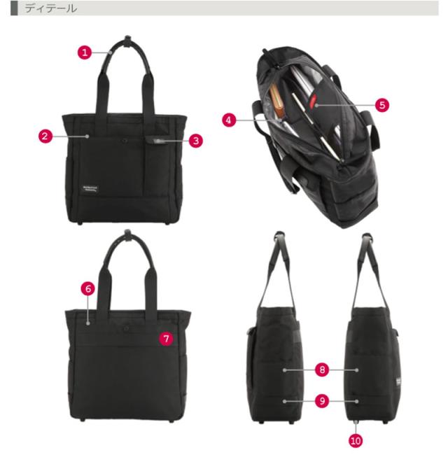 | 仕様 | 前面…ファスナーポケット (中にオープンポケット×3)フラップポケット(内部にペンホルダー×2) 側面…オープンポケット×1、セットアップ用ベルト 内側…2段式オーガナイザーを装備(ポケット×5)、パッド入りPCポケット(13インチのノートパソコン対応/前方にオープンポケット×2) |