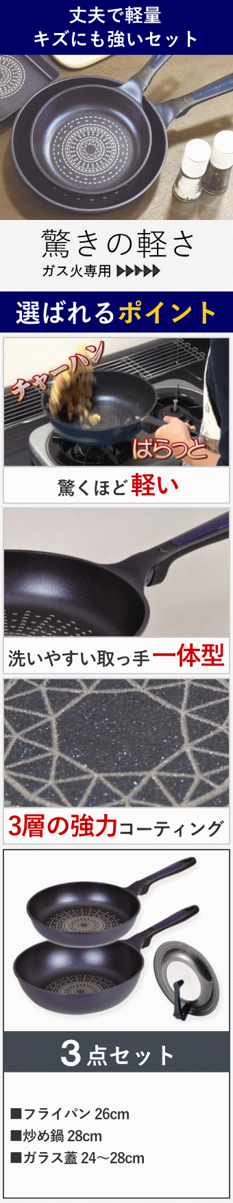 平均的な家族で必要なフライパンをセットにしました こびりつきにくくお手入れも楽なマーブルコートのシリーズに中身が見えて自立するフライパンカバーのセットです