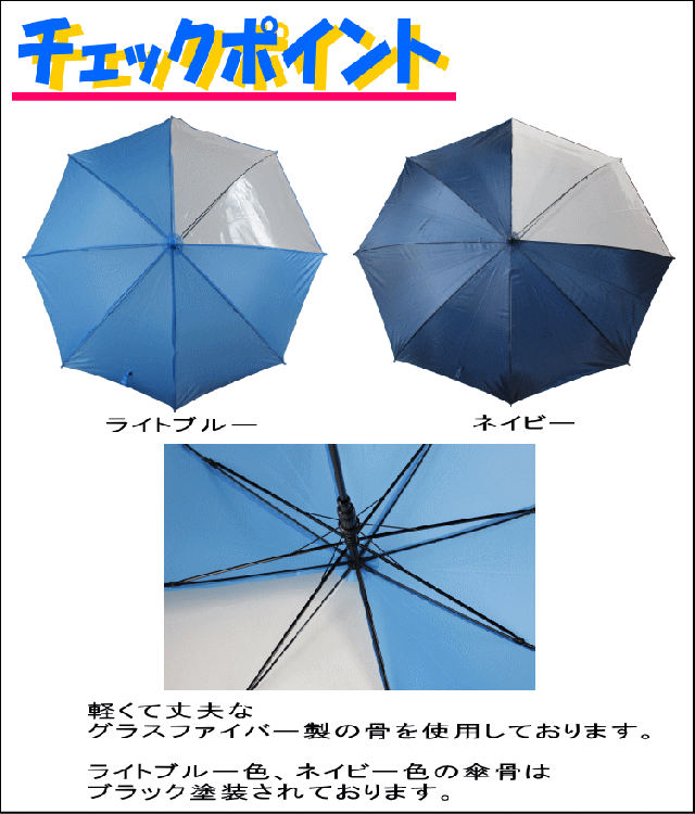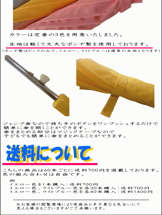| 備考 | ジャンプ式の傘ですので 持ち手のボタンを押すだけで 簡単に傘を開くことができます。 1/4をクリア加工しておりますので 傘を斜めに持っても前が 見やすくなっております。 60本ごとに送料700円がかかります。 色の組み合わせは自由です。 送料無料の他の商品を 一緒に購入されました場合にも 送料はかかります。 |