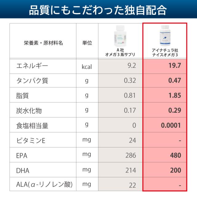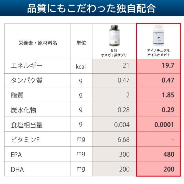 エネルギー 19.7kcal、たんぱく質 0.47g、脂質 1.85g、n-3系脂肪酸 0.68g、炭水化物 0.29g、食塩相当量 0.0001g、EPA 480mg、DHA 200mg